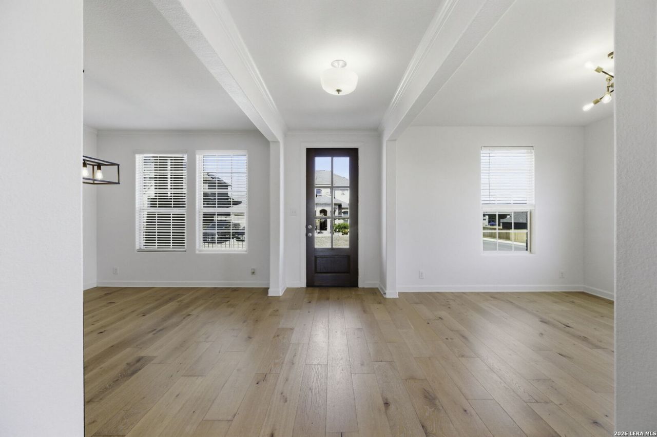 Modern luxury meets functional design in this stunning 4-bedroom, 3.5 bath residence featuring a versatile layout across two levels and sits on an oversized corner lot. The first floor offers high ceilings and custom wood flooring throughout. The formal dining room features a custom dry bar with a built-in wine refrigerator, stone countertops and custom lighting. Located across from the dining room is additional open living space. The heart of the home is the open kitchen, boasting white cabinetry, stone countertops, a gas range with a stainless vent hood, and a massive walk-in pantry. This area flows into the family room, centered by a floor-to-ceiling gas stone fireplace. A private study near the center of the home provides a quiet workspace. The primary retreat is located on the main floor for maximum privacy. It features a spa-inspired ensuite bath with dual vanities, a garden tub, and a separate glass shower. This suite is completed with dedicated his and hers walk-in closets. The second level of the home offers a massive game room that serves as a third family area and features 3 additional bedrooms and 2 full baths. Step outside to an extended covered patio with an additional attached paved terrace with planters. The backyard also includes a built-in playscape making it wonderful for summer BBQs and winding down in the evening. Essential features include a mudroom with a built-in bench, a large utility room, water softener, sprinkler system, security system and a two-car garage. Experience the outdoors at the community pool or the park and playground! Go for a walk or bike ride along the extra wide path that follows Arcadia Path or stroll or jog the wandering nature trails throughout 200 acres of open green space. This home is located in NISD with award winning schools and near tons of shopping, dining, and major highways. Do not miss the opportunity to make this your new home!