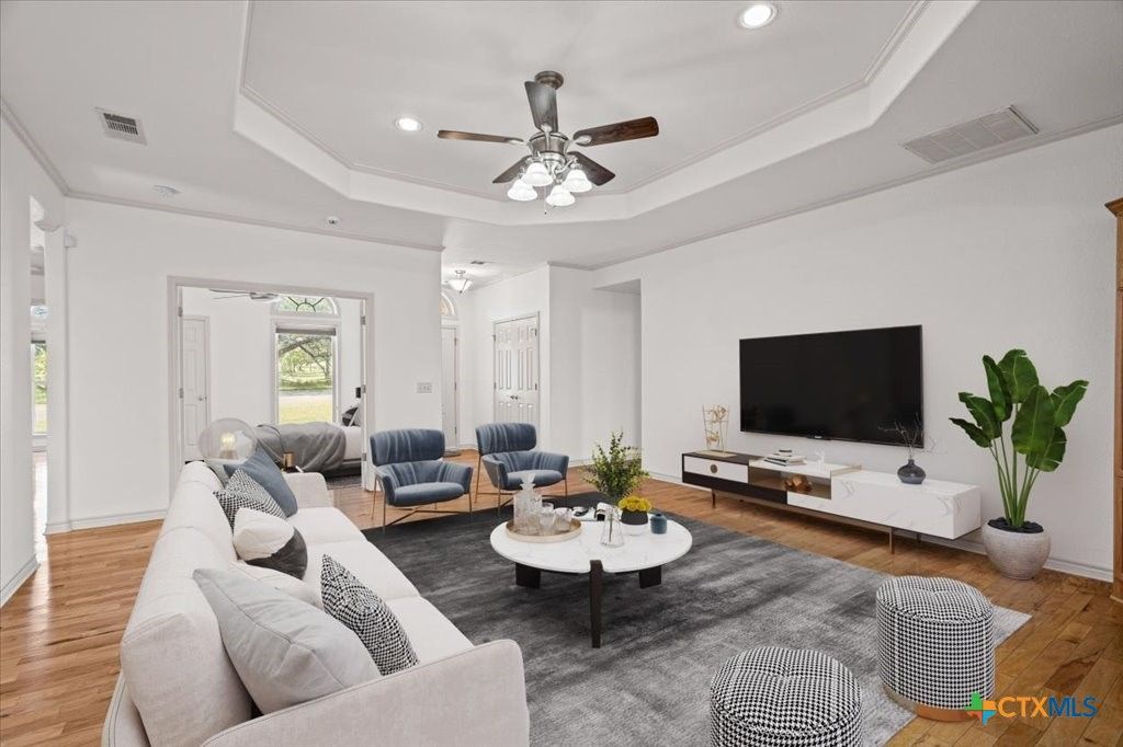 This Highland Acres home offers an amazing opportunity to own a home on over half an acre while remaining close to the local conveniences of downtown Burnet. This 3 bedroom, 3 bathroom home features a massive detached workshop and additional living quarters that are hard to find. Inside the main house, the floor plan is open and connected. As you walk through the front door, the warm hardwood flooring immediately draws you across the living room and into the kitchen and breakfast nook. The kitchen is equipped with stainless steel appliances and a central island with a built-in sink. Modern upgrades like HEPA HVAC filters, reverse osmosis water filtration, and a central vacuum system are included in this home. Just off the living room, a dedicated home office sits behind French doors, providing a quiet place to work without feeling disconnected from the rest of the household. The primary bedroom features a tray ceiling that adds a sense of volume to the space. The attached primary bathroom is a full ensuite with a soaking tub and separate shower, with two walk-in closets?one of which is a custom-built safe room framed with 1/4 steel and a steel door. Two additional bedrooms are situated to share a secondary bathroom. Beyond the interior, the home includes an attached two-car garage, but the standout feature is the detached workshop. This secondary building includes its own bathroom and finished living space, offering a flexible area for a gym or guest suite. Located in the Highland Acres area of Burnet, this property is surrounded by mature oak trees and a lush, green backyard that is maintained by an irrigation system fed by a private well. You are a short drive from the local dining and shops in downtown Burnet, with easy access to Highway 281 and Highway 29 for trips into Liberty Hill or Georgetown. The half acre lot ensures you have plenty of room to expand, park a boat for nearby Lake Buchanan, or simply enjoy the quiet landscape of the Texas Hill Country.