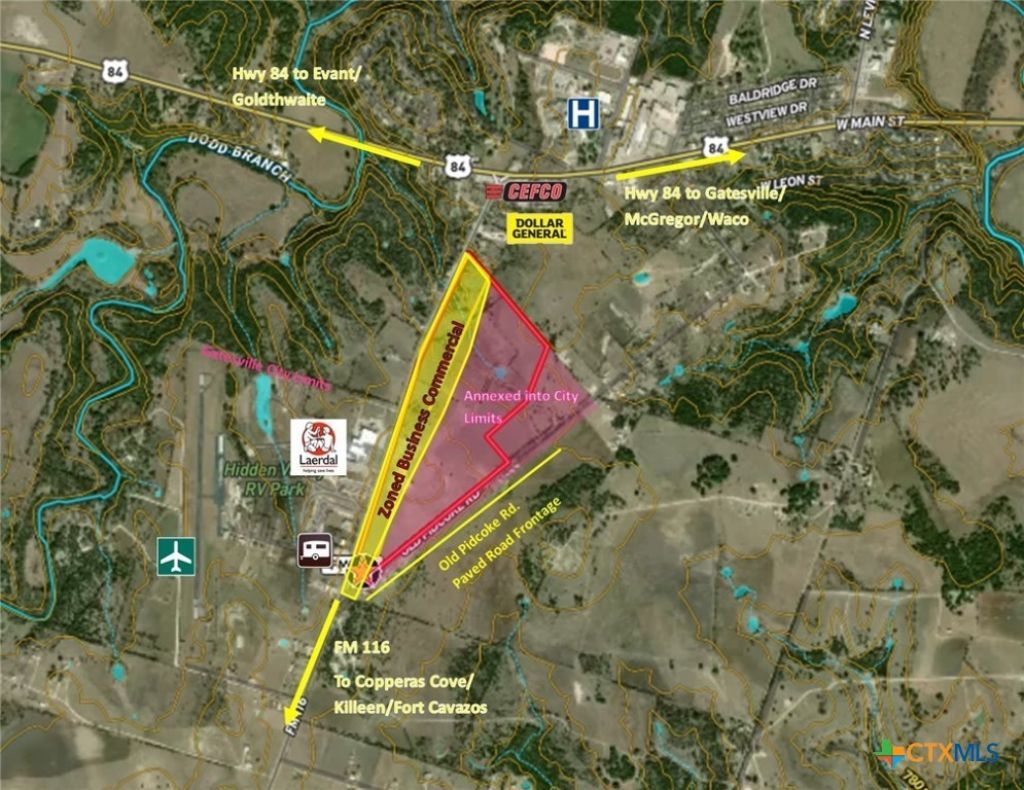 Approximately 116 acres of city-annexed development land in Gatesville, Texas, offering a rare master-planned opportunity positioned for commercial, industrial, mixed-use, logistics, distribution, and employment-driven residential development. Strategically located with frontage and access along Texas FM 116 and Old Pidcoke Road, the property provides excellent visibility, multiple access points, and the ability to separate uses and traffic patterns, making it well suited for anchor retail or service commercial along the frontage with flex, light industrial, logistics, or distribution uses and residential or workforce housing positioned behind. City utilities are available, and the property maintains AG tax status, allowing favorable holding costs during planning, entitlement, and phased development. The site is located directly across from the Gatesville Municipal Airport, providing regional air access for corporate users, contractors, government agencies, defense-adjacent operations, and logistics support. The property is also located near Fort Hood, one of the largest military installations in the United States, driving sustained demand for housing, retail services, logistics, medical, and industrial development. The region benefits from proximity to Central Texas aerospace and advanced manufacturing activity, including SpaceX operations, supporting long-term employment growth tied to military, defense, manufacturing, and transportation sectors. Gatesville offers a business-friendly environment, low crime rate, stable workforce, and favorable tax climate, with convenient access to Waco, Temple, and Killeen and reasonable drive times to Austin, Dallas?Fort Worth, and Houston. This tract supports phased or multi-user development, campus-style projects, or master-planned mixed-use concepts with multiple exit strategies and long-term upside in a growing Central Texas corridor.