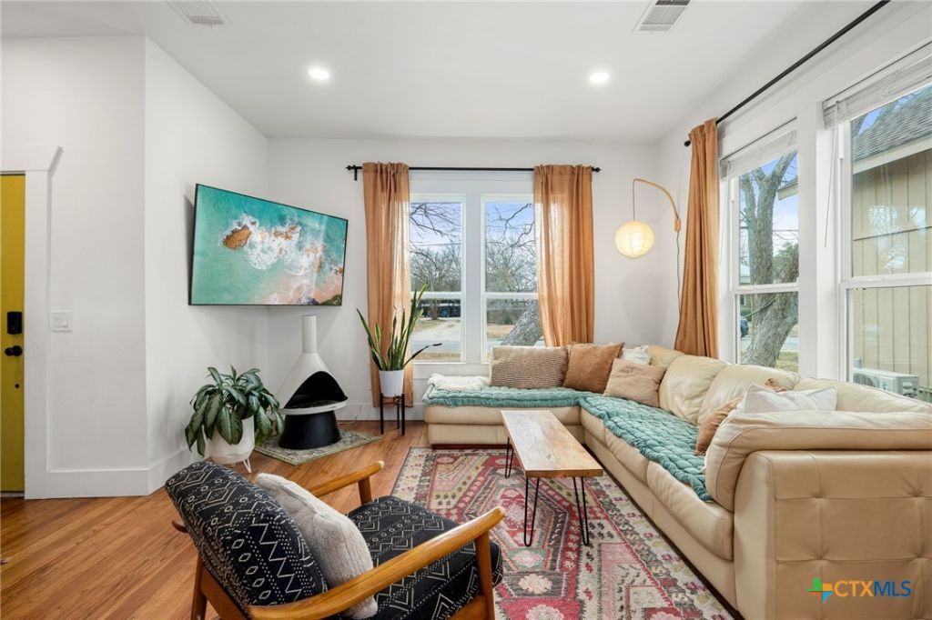 Welcome home to this charming 1-story 3 bedroom, 2 bath beauty that greets you with the sweetest front porch, perfect for morning coffee and evening unwinding. Fully remodeled just a few years ago, this home blends fresh, airy updates with timeless character, preserving original details like the stunning wood floors and exposed shiplap ceilings that honor its 100-year-old heritage. Tall ceilings and oversized windows flood the home with natural light, creating a warm glow?especially during golden hour. The kitchen is a true showpiece, featuring quartz countertops, a large island, updated appliances, open shelving, abundant cabinetry, and a farmhouse apron-front sink perfectly positioned beneath a sun-filled window. The mud and laundry room adds even more charm with patterned tile flooring and an arched door leading to the back deck overlooking a spacious yard ideal for relaxing or entertaining. All three bedrooms offer unique character, and the primary suite includes a walk-in closet. Both bathrooms have been thoughtfully updated with stylish tile and modern fixtures. Beyond the main home, two fully finished, two-story buildings provide incredible flexibility. Fully wired, insulated with spray foam, and equipped with split units for heating and cooling, these spaces are ideal for a workshop, art studio, gym, office, or additional storage. The 14x20 building is currently used as an artist studio, while the 16x24 building serves as a gym with an upstairs office. Located less than a mile from the historic square in Lockhart, youll enjoy easy access to local shops, dining, and community charm, all just a short stroll away. This home truly feels like home the moment you arrive.