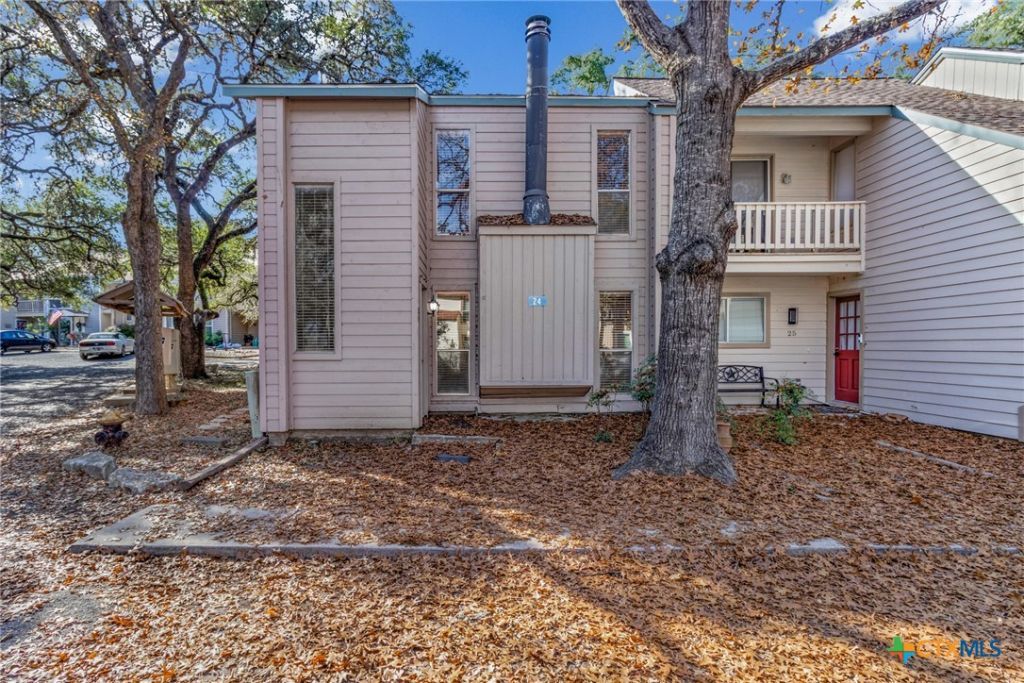This property qualifies for 0% down with our preferred lender! Corner unit with a rare layout and even rarer outdoor space. The entire home has been updated. Tile flooring runs throughout downstairs, including the kitchen and downstairs bedroom, while the upstairs features LVP flooring, with carpet only on the stairs. Every bedroom functions like a primary suite with its own full bathroom and walk-in closet, making this an ideal setup for roommates or a strong rental property. The downstairs bedroom opens directly to the backyard, and this is one of the only units in the entire complex with a fully fenced yard and a private shed. Upstairs, theres a balcony overlooking the common area, along with a wood-burning fireplace in the living room that adds character and warmth. The location ties it all together! The golf course is just a few minutes away. Downtown Wimberley is about five minutes away for coffee, food, and local events. San Marcos is roughly a 20-minute drive with Texas State University and San Marcos Premium Outlets, while Austin is about 45 minutes north and San Antonio is just about an hour south. Additionally, you have private access to Cypress Creek and The Watering Hole, which is just steps away for swimming, fishing, kayaking, and relaxing by the water. Youve got a property that checks both lifestyle and rental boxes!