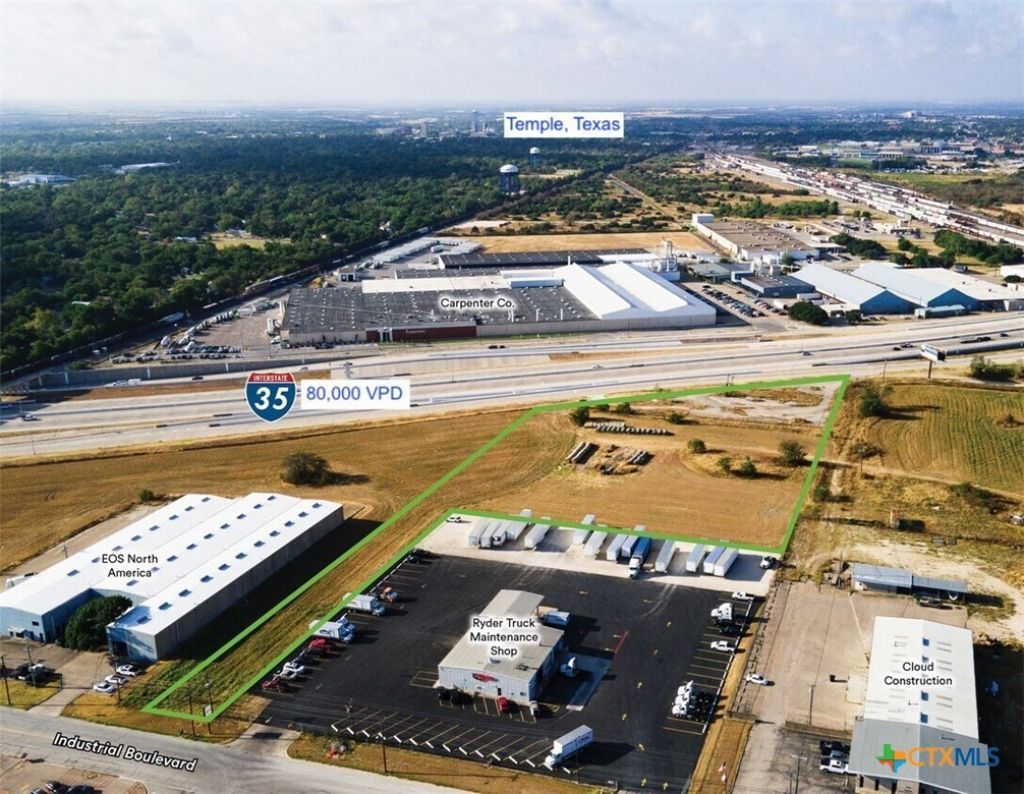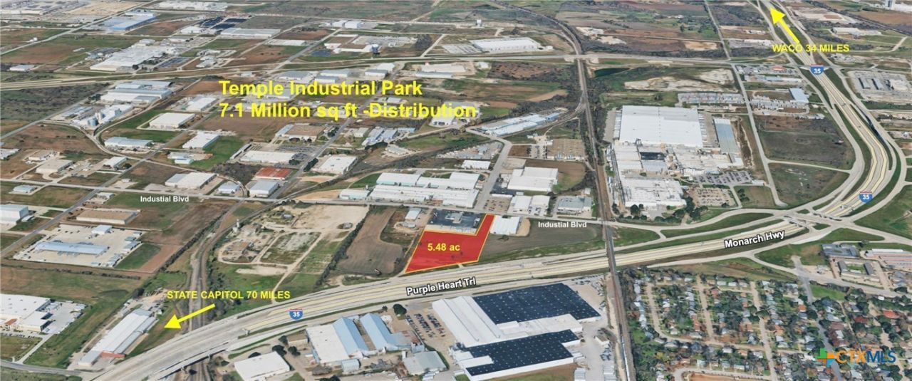 508 feet of frontage on IH-35 with great visibility. This 5.48 acre platted industrial lot has direct access to both IH-35 and Industrial Blvd at the gateway to the Temple's booming Industrial Park with over 7M sq ft of warehouse and distribution. Lot is surrounded by major industrial users and distribution centers, traffic count 80,000 VPD. All utilities on site. In addition to warehouse/distribution, it is great for truck services, truck parking, dealerships, hospitality, gas, retail, storage, service center, or personal warehouse. Seller intends a 1031 exchange.