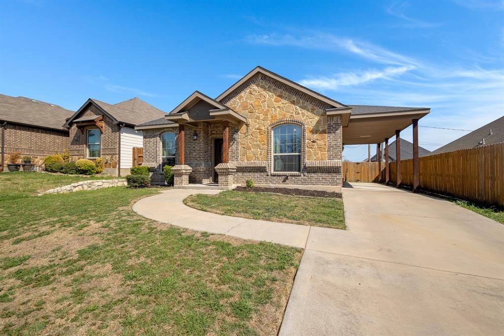 Built in 2016, this charming 3 bedroom, 2 bath home offers an inviting open concept layout with tall ceilings and stylish finishes throughout. The spacious living, dining, and kitchen areas flow seamlessly together, highlighted by wood look ceramic tile flooring in the main spaces and durable LVP in the bedrooms. An art niche in the living room adds a custom touch, perfect for showcasing your favorite pieces. The kitchen is designed for both function and style, featuring granite countertops, a center island with breakfast bar seating, SS appliances, real wood cabinetry and a pantry for added storage. Outside, you’ll find attractive stone and brick detailing on the front elevation, a covered patio overlooking a terraced backyard and a nicely sized storage shed. With direct access from the living room, a 20x9 carport area provides covered parking. Located just minutes from the iconic Fort Worth Stockyards and the vibrant dining and entertainment scene nearby, this home also offers easy access to I-35 and quick commutes to downtown Fort Worth and the Cultural District. Comfort, character, and convenience all come together in this well-located property.