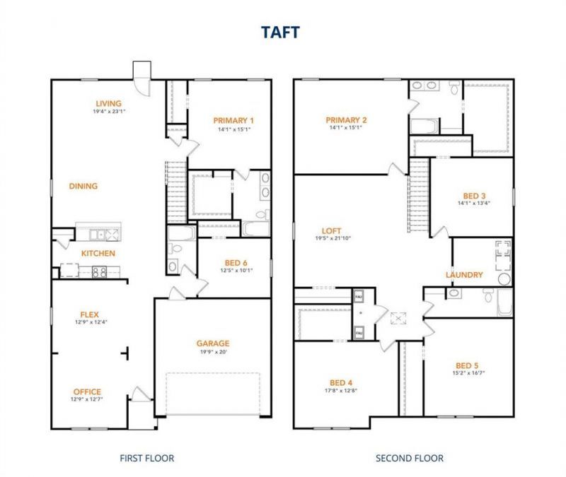 MLS# 21110131 - Built by NHC - Ready Now! ~ The Taft features two primary suites, each with its own private bathroom—one located on the main level and the other on the upper level, providing ultimate flexibility and privacy. As you enter the Taft, you’ll pass a versatile office and a flexible room that can be customized to fit your needs. Continue into the open-concept living area, where the kitchen with an island overlooks the dining area and spacious family room—creating the perfect space for family gatherings and entertaining. The main level also includes a primary suite off the family room, an additional bedroom, and a full bathroom, offering plenty of space for everyone. Upstairs, the second primary suite offers a private retreat, while 3 additional bedrooms, another full bathroom, a laundry room, and a spacious loft complete the upper level.