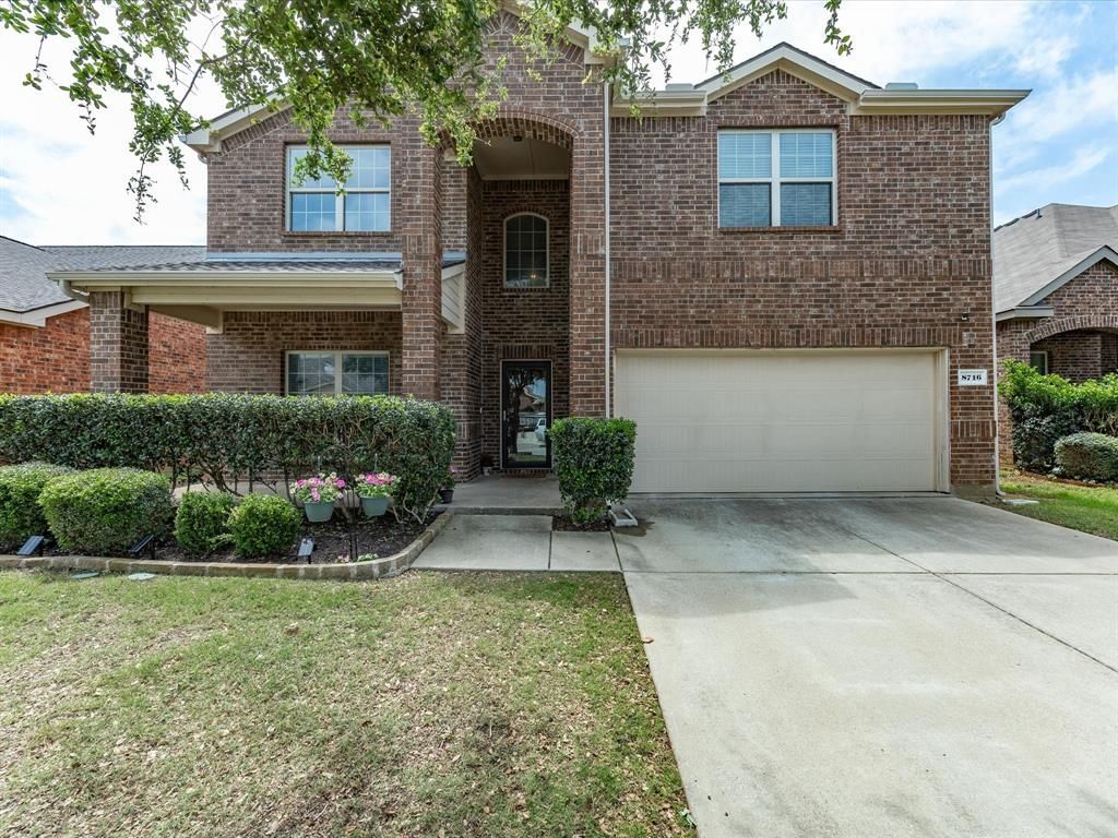 Sequestered on a desirable interior lot, this stunning two-story home boasts a charming front porch, a beautiful and relaxing pool with waterfall feature, and recent updates including a 2021 roof and gutters! Step inside to a grand entry that opens to a versatile formal living or dining space. The expansive living room impresses with a cast stone fireplace and a wall of windows that flood the home with natural light. The inviting kitchen offers a raised breakfast bar, granite countertops, a center island, 2021 tile flooring, and a sunlit breakfast nook. A full-size utility room with built-in cabinetry adds convenience. The private first-floor primary suite is generously sized, offering space for a sitting area and a spa-inspired bath complete with dual sinks, a garden tub, separate shower, and walk-in closet. Upstairs, discover a huge game room, ideal for a pool table plus plenty of space for your flat screen to enjoy movie night at home. Spacious secondary bedrooms include a private guest suite downstairs and two additional guest rooms upstairs, providing comfort and flexibility for family and guests. Step outside to your own backyard oasis featuring a covered patio, board-on-board fence, and a pergola that overlooks the sparkling pool, perfect for entertaining or relaxing in style. Amazing community with 2 pools, walking trails, catch and release pond and playgrounds! Minutes from Little Elm and close enough to all of the exciting new attractions in Frisco including The Star, PGA golf courses and the upcoming Universal Kids Resort!